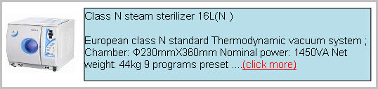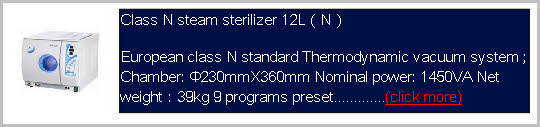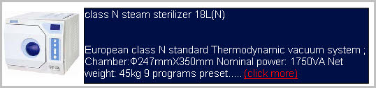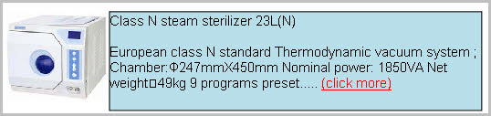 Class N steam sterilizer 23L(N) European class N standard Thermodynamic vacuum system ; Chamber:Φ247mmX450mm Nominal power: 1850VA Net weight:49kg 9 programs preset..... (click more)